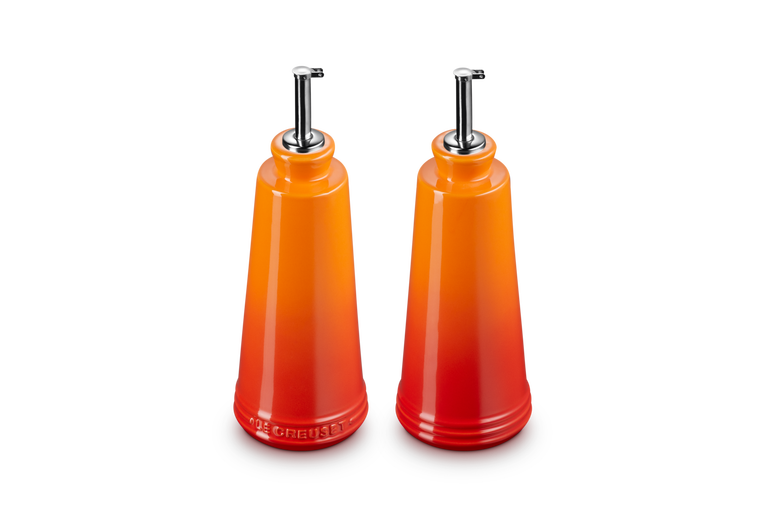 Whether dressing a salad or adding a drizzle of oil to a hot pan, this contemporary stoneware set is designed for everyday use. It includes one cruet with Le Creuset branding and one without for easy identification, along with stainless steel nozzles for precise pouring.