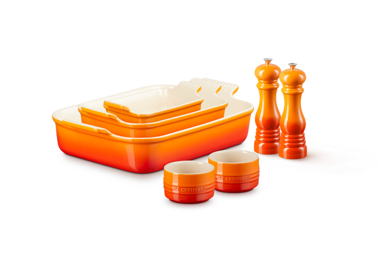 Upgrade your cookware with this comprehensive set. It brings together our 19cm, 26cm and 32cm rectangular dishes, two stackable ramekins, and a pair of 21cm salt and pepper mills. Everything you need to create a delicious feast, whether you're roasting meat and vegetables or baking indulgent desserts and savoury snacks.